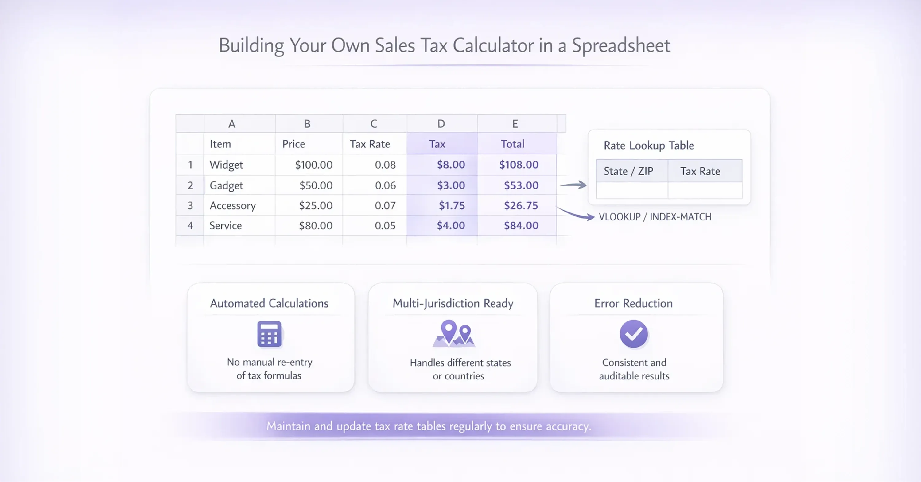 If you sell into multiple states or countries, add a lookup table. List each jurisdiction and its rate, then use a VLOOKUP or INDEX/MATCH function to pull the correct rate automatically. This small investment in setup saves hours per week and nearly eliminates manual errors. For instance, an online seller shipping from Texas to customers in California, New York, and Florida would maintain a reference table with each state's combined rate and let the spreadsheet do the math per order line.