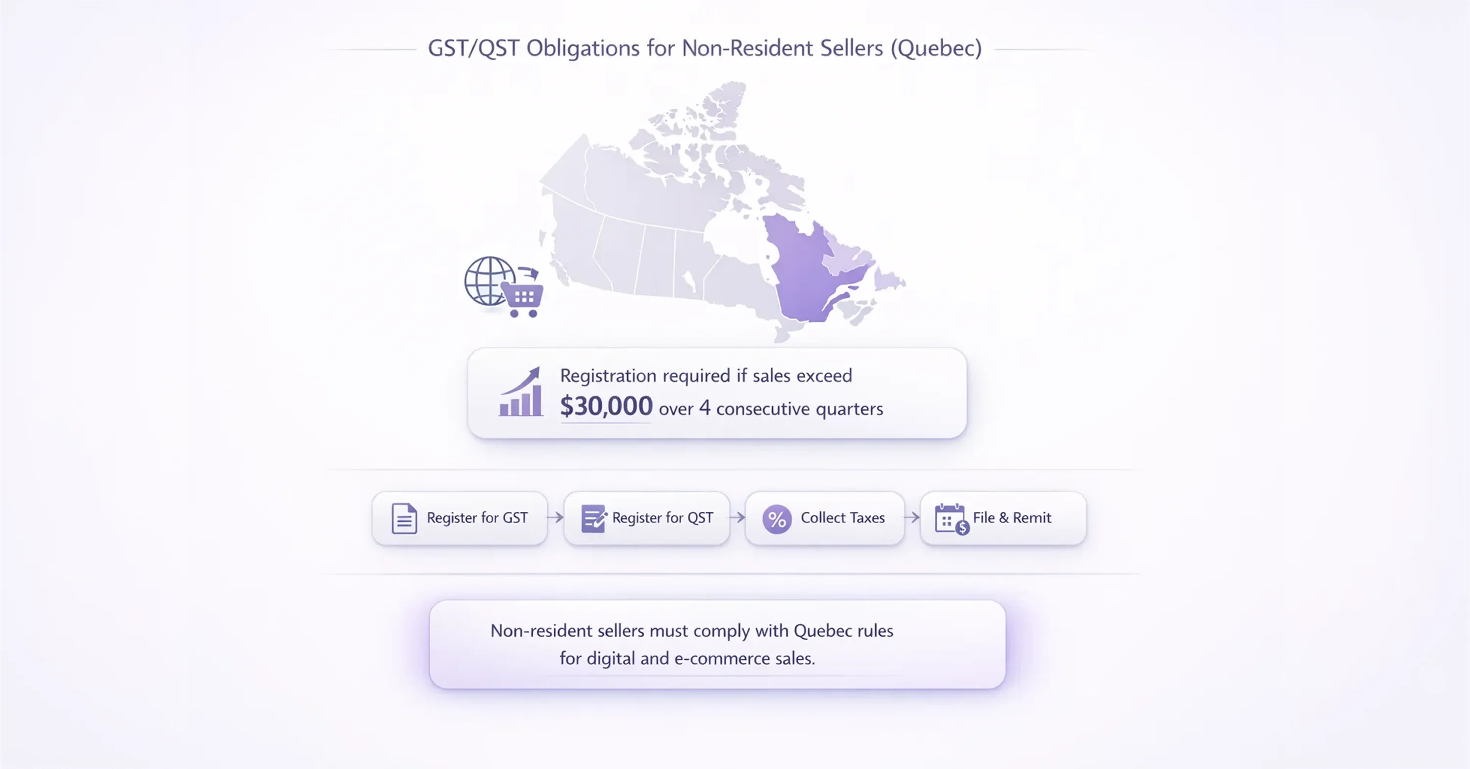 Quebec has been aggressive about extending tax collection requirements to out-of-province and international sellers. The province requires certain non-resident sellers and digital platform operators to register and collect QST on taxable goods and services sold to Quebec consumers. This applies to e-commerce businesses, SaaS providers, and marketplace sellers reaching Quebec customers.
