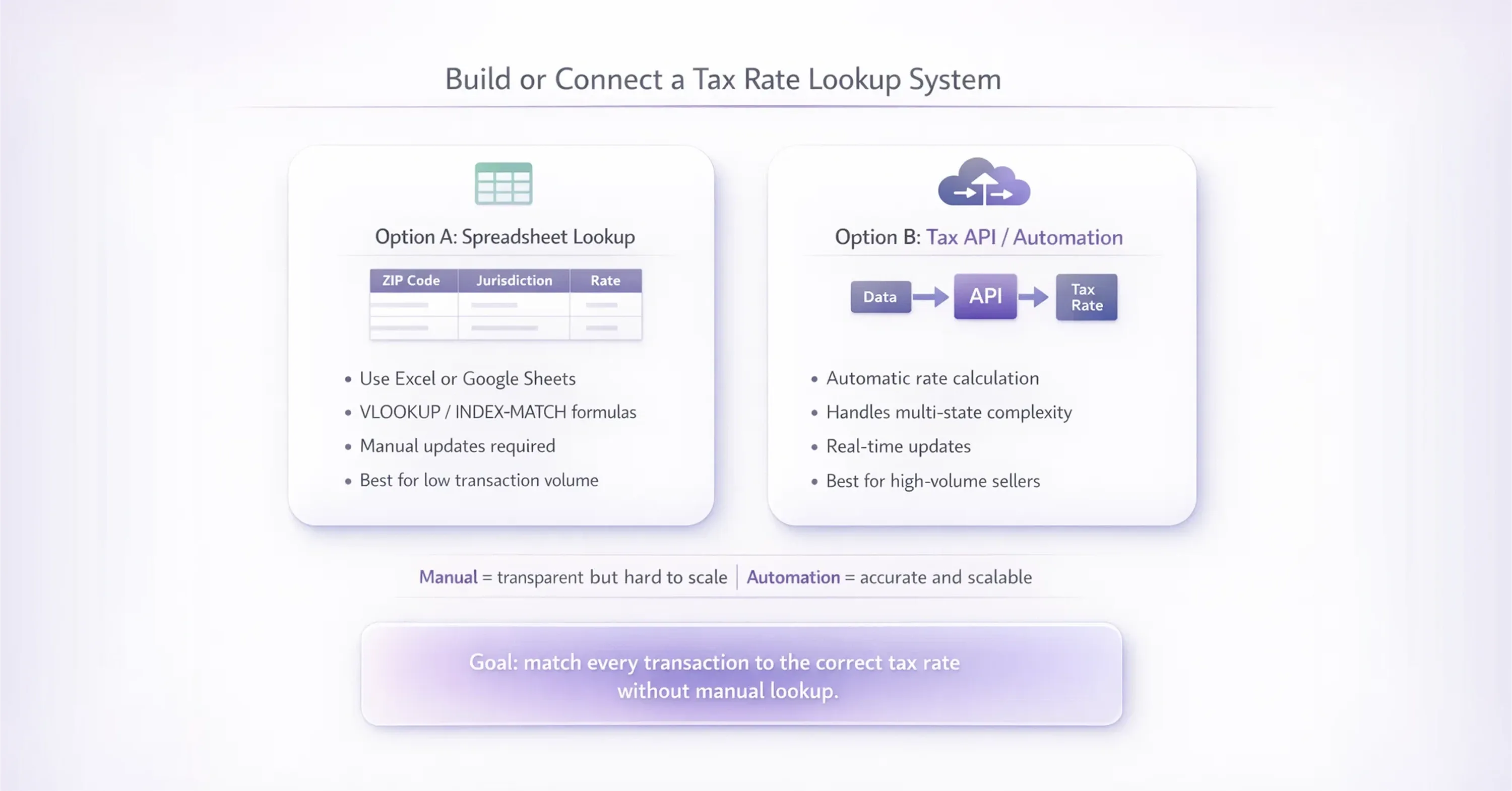 This method is transparent and easy to audit. But it has limits. Rate tables change quarterly in many states, so you need a process to refresh them. And if you sell in dozens of states, maintaining all those tables gets heavy. This is one of the most common avoidable mistakes we encounter - a spreadsheet that was built carefully and then never updated.