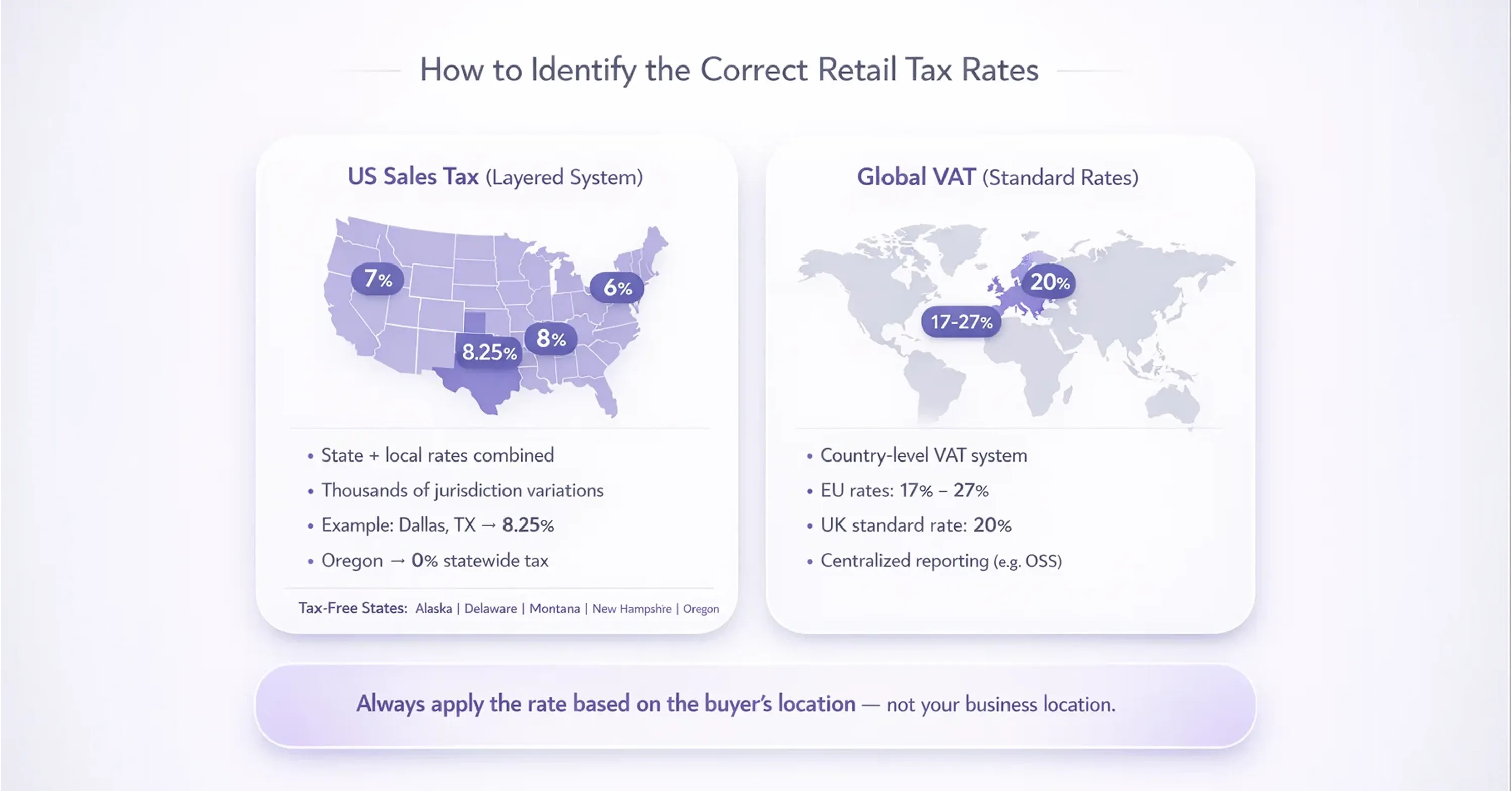 To better track US rates and their changes, see the US Sales Tax Explained: State-by-State Guide, which breaks down combined rates, sourcing rules, and compliance tips for each state and major city.