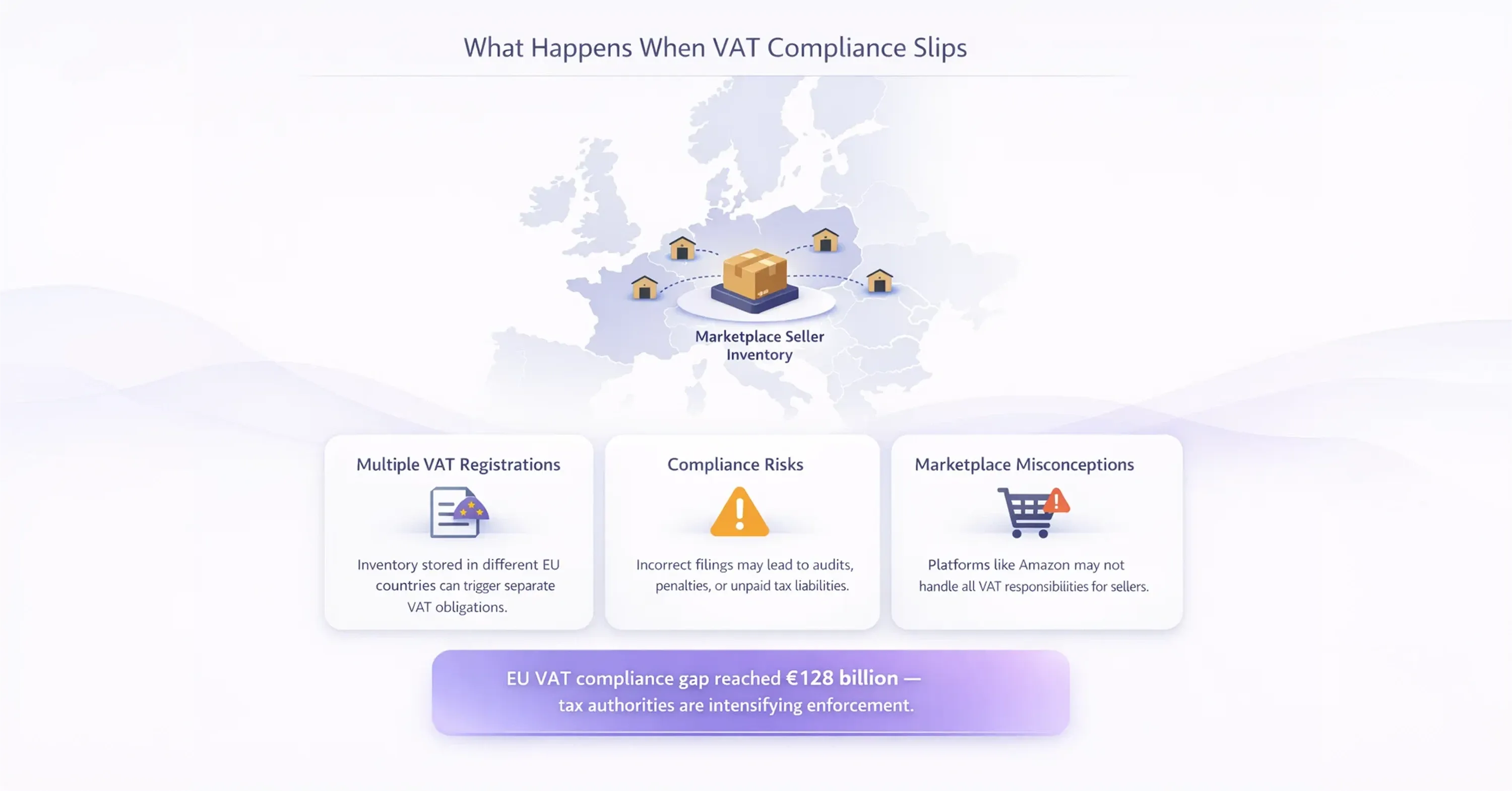 Tax authorities are closing in on the remaining gaps, and marketplace sellers are firmly in their sights. A small seller based in the UK using Amazon's Fulfilled by Amazon (FBA) program might have inventory stored in warehouses across Germany, France, Poland, and the Czech Republic. Each storage location can trigger a VAT registration requirement. If that seller assumes Amazon handles everything, they could end up with unpaid VAT liabilities in multiple countries.
