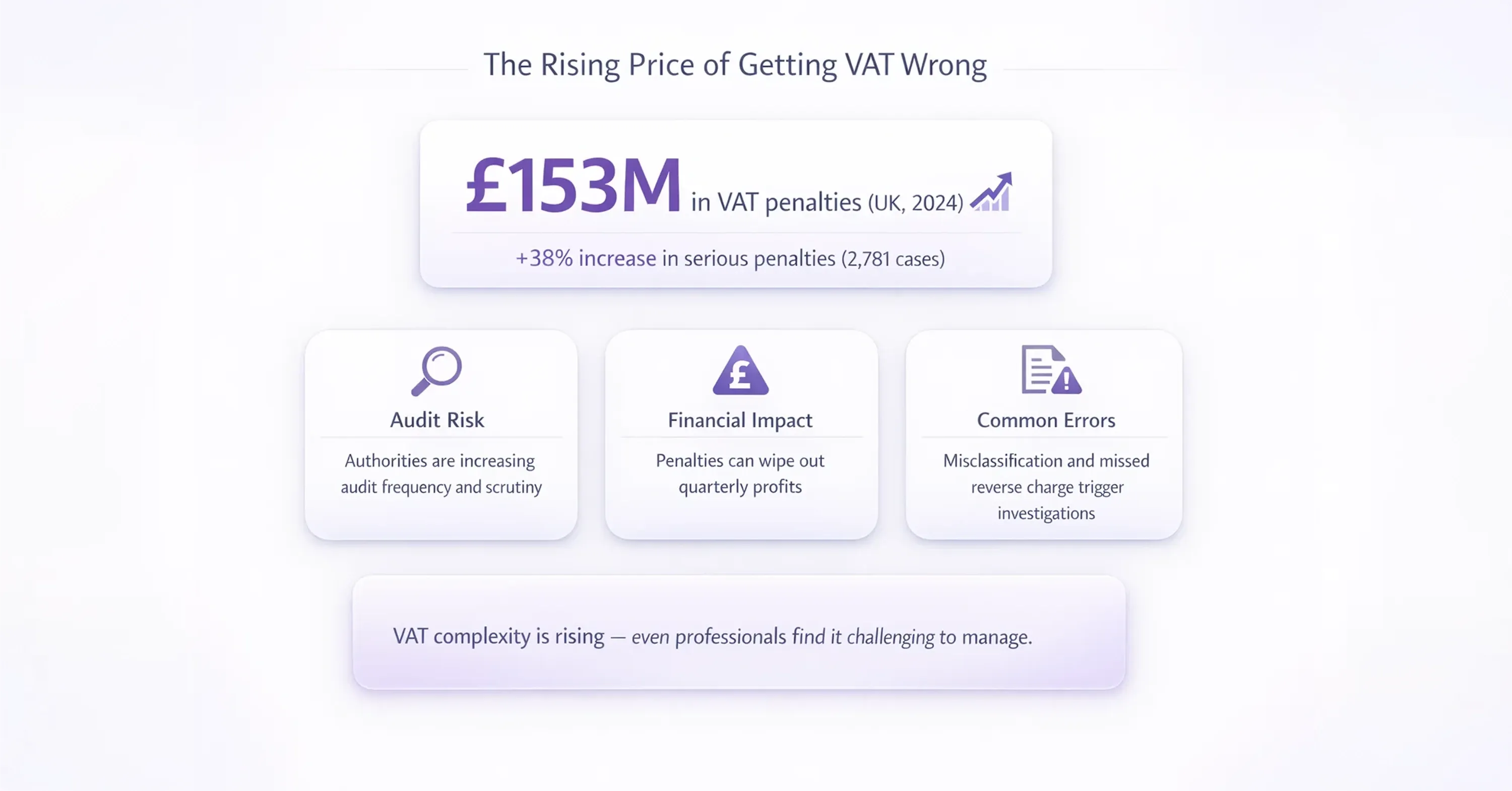 In the UK alone, HMRC collected £153 million in VAT penalties across 46,376 cases in the year to March 2024. More concerning, HMRC issued 2,781 serious penalties for deliberate VAT return errors that same year, up from 2,011 in the prior period, a 38% jump. The trajectory is clear: authorities are auditing more aggressively and punishing more harshly.